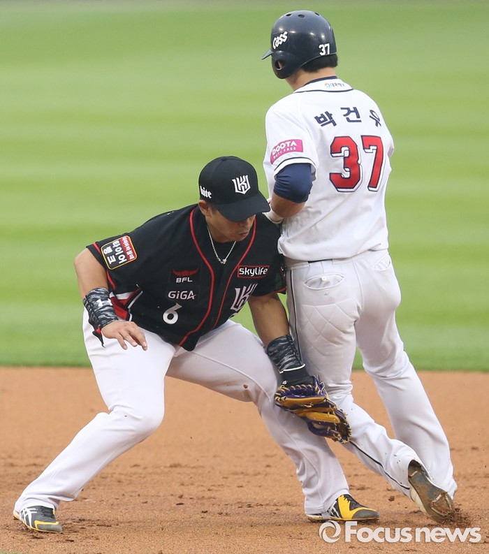 | △ 2루에서 아웃되는 두산 박건우 |