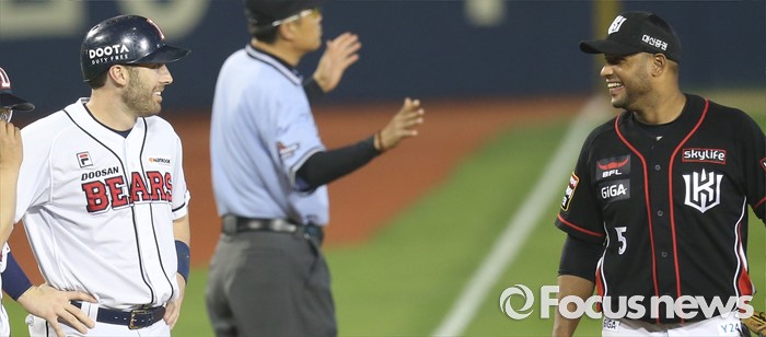 (서울=포커스뉴스) 23일 서울 잠실구장에서 열린 2016 프로야구 kt-두산 경기 6회말 2사 3루에서 두산 3루주자 에반스와 kt 3루수 마르테가 웃으며 대화하고 있다.