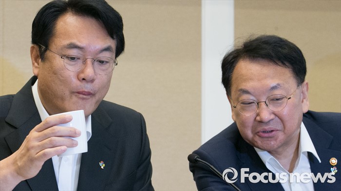 (서울=포커스뉴스) 24일 오전 서울 여의도 국회 귀빈식당에서 열린 2016년 하반기 경제정책방향 당정간담회에 참석한 정진석(왼쪽) 새누리당 원내대표와 유일호 경제부총리 겸 기획재정부 장관이 대화하고 있다.