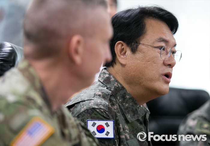 (의정부=포커스뉴스) 정진석 새누리당 원내대표가 24일 오전 경기도 의정부 미2사단 한미연합사단을 방문해 부대 현황보고에 앞서 인사말을 하고 있다. 왼쪽은 테드 마틴 미2사단장.