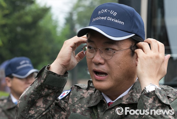 (의정부=포커스뉴스) 정진석 새누리당 원내대표가 24일 오전 경기도 의정부 미2사단 한미연합사단을 방문해 군용 모자를 쓰고 있다.