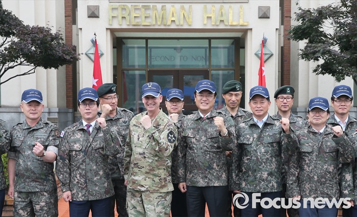 (의정부=포커스뉴스) 정진석 새누리당 원내대표, 김영우 국방위원장 등 의원들이 24일 오전 경기도 의정부 미2사단 한미연합사단을 방문해 테드 마틴 미2사단장 등 군 관계자들과 기념촬영을 하고 있다.