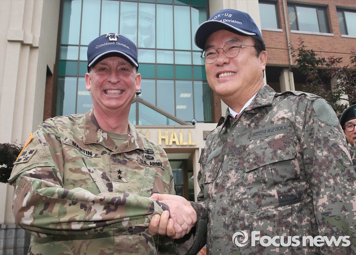 (의정부=포커스뉴스) 정진석(오른쪽) 새누리당 원내대표가 24일 오전 경기도 의정부 미2사단 한미연합사단을 방문해 테드 마틴 미2사단장과 악수하고 있다.