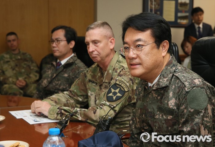 (의정부=포커스뉴스) 정진석(오른쪽) 새누리당 원내대표가 24일 오전 경기도 의정부 미2사단 한미연합사단을 방문해 부대현황 보고에 앞서 인사말을 하고 있다. 가운데는 테드 마틴 미2사단장.