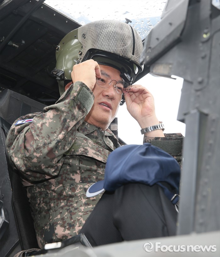 (의정부=포커스뉴스) 정진석 새누리당 원내대표가 24일 오전 경기도 의정부 미2사단 한미연합사단을 방문해 부대현황 보고를 받은 뒤 아파치 헬기 탑승체험을 하고 있다.