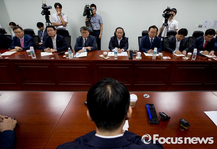 (서울=포커스뉴스) 24일 오후 서울 여의도 국회 의원회관에서 윤재옥 새누리당 대구시당 위원장, 김부겸 더불어민주당 의원, 홍의락 무소속 의원 등 여야 대구지역 의원들과 강호인 국토교통부 장관이 영남권 신공항 백지화 관련 면담을 하고 있다.