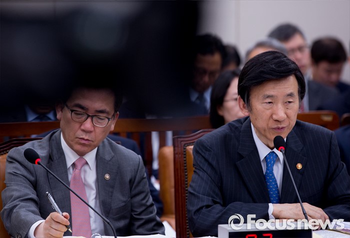 (서울=포커스뉴스) 24일 오전 서울 여의도 국회에서 열린 외교통일위원회 전체회의에 참석한 윤병세(오른쪽) 외교부 장관이 의원들의 질의에 답하고 있다.