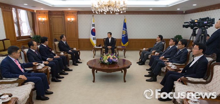 (서울=포커스뉴스) 황교안(가운데) 국무총리와 대구지역 국회의원들이 24일 오후 서울 종로구 정부서울청사에서 영남권 신공항 백지화 관련 면담하고 있다.