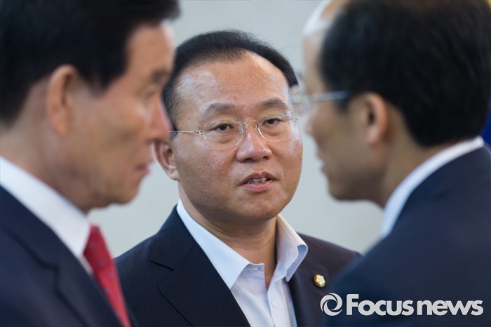 (서울=포커스뉴스) 대구지역 국회의원들이 24일 오후 서울 종로구 정부서울청사에서 영남권 신공항 백지화 관련 황교안 국무총리와 면담 전 대화를 나누고 있다. 왼쪽부터 곽대훈 새누리당 의원, 윤재옥 대구시당 위원장, 추경호 의원.