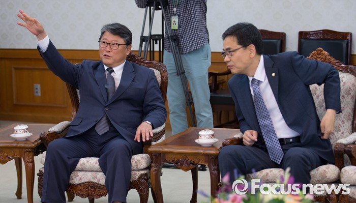 (서울=포커스뉴스) 조원진(왼쪽) 새누리당 의원과 곽상도 의원이 24일 오후 서울 종로구 정부서울청사에서 영남권 신공항 백지화 관련 황교안 국무총리와 면담 전 대화를 나누고 있다.