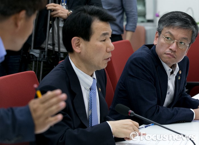 (서울=포커스뉴스) 24일 오후 서울 여의도 국회에서 열린 새누리당 브렉시트(Brexit) 관련 긴급현안 점검회의에 참석한 최상목(오른쪽) 기획재정부 1차관과 정은보(가운데) 금융위원회 부위원장이 관계자와 대화하고 있다.