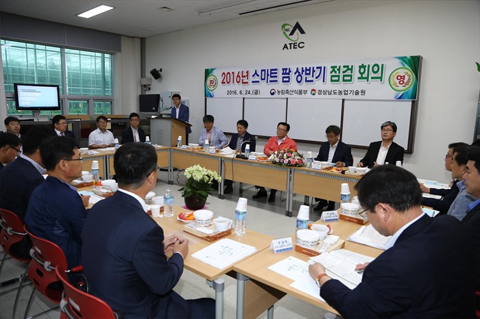 (진주=포커스뉴스) 이동필 농림축산식품부 장관이 24일 경남 진주시 경남도농업기술원 첨단농업에서 열린 스마트 팜 확산 상반기 점검회의에서 스마트 팜 추진성과를 점검하고 현장의 의견을 청취하고 있다. <사진제공=농림축산식품부>