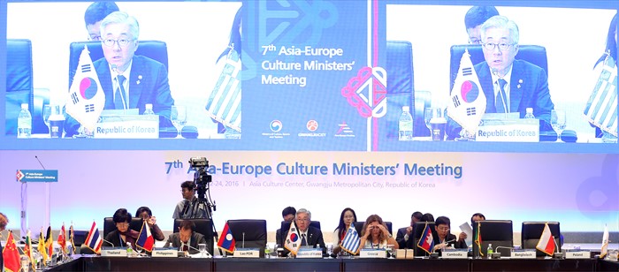 (광주=포커스뉴스) 김종덕 문화체육관광부 장관이 24일 광주시 동구 국립아시아문화전당 국제회의장에서 열린 제7차 ASEM 문화장관회의 본회의에서 의장성명서를 발표하고 있다. <사진제공=문화체육관광부>