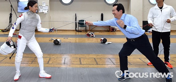 (서울=포커스뉴스) 정세균(오른쪽) 국회의장이 24일 오후 서울 노원구 태릉선수촌을 방문해 브라질 리우 올림픽을 앞두고 훈련 중인 남현희 선수와 펜싱 대결을 하고 있다.
