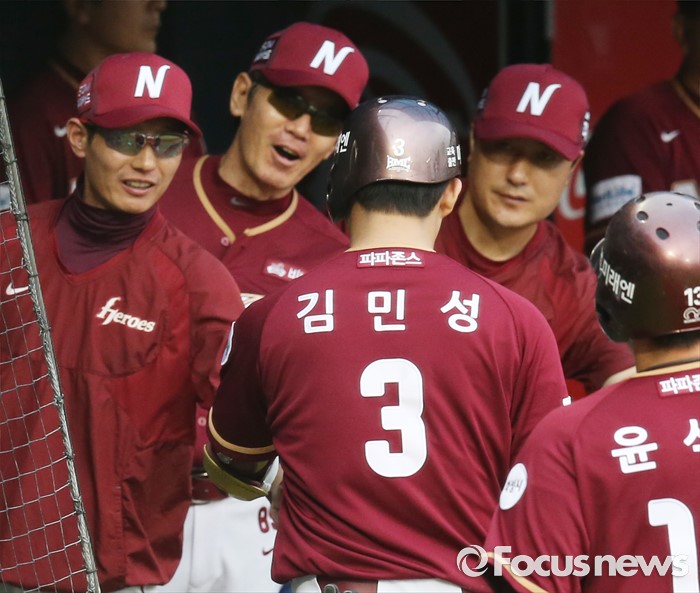 (서울=포커스뉴스) 24일 서울 잠실구장에서 열린 2016 프로야구 넥센-LG 경기 1회초 2사 1,3루에서 넥센 김민성이 좌월 3점 홈런을 치고 덕아웃에서 염경엽 감독의 환영을 받고 있다.