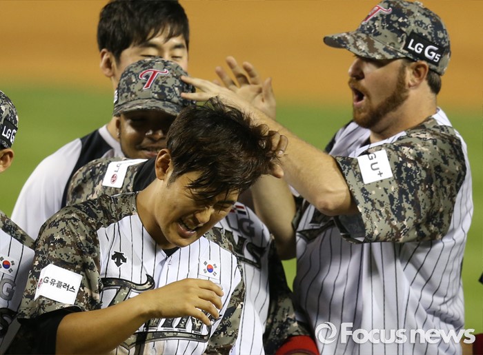 (서울=포커스뉴스) 24일 서울 잠실구장에서 열린 2016 프로야구 넥센-LG 경기에서 역전승한 LG의 코프랜드는 히메네스, 히메네스는 정주현의 머리를 쓰다듬고 있다.