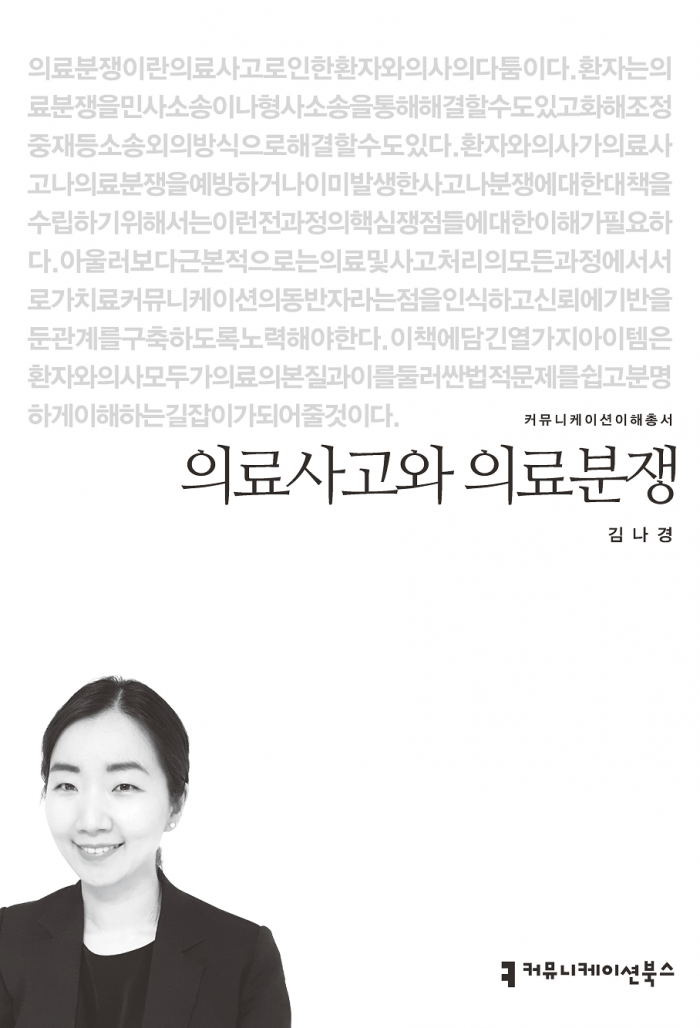 저자 김나경은 의료 계약, 설명과 동의, 의료사고와 분쟁, 의료 민사소송 및 민사책임, 의료 형사소송 및 형사책임, 환자와 의사의 화해, 의료분쟁 조정, 의료분쟁 중재 등 열 가지 아이템에 대해 자세하게 서술했다. 커뮤니케이션북스. 9800원.'의료사고와 의료분쟁' 표지.<사진제공=커뮤니케이션북스>