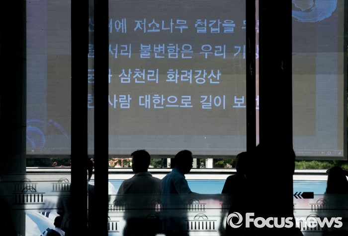 (서울=포커스뉴스) 26일 오후 서울 여의도 국회 의원회관 앞 차량에 미래로 가는 바른 역사 협의회 발대식 및 식민사학 규탄대회를 중계하는 전광판이 설치되어 있다.