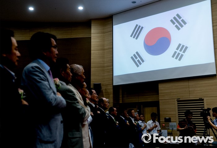 (서울=포커스뉴스) 26일 오후 서울 여의도 국회 의원회관에서 열린 미래로 가는 바른 역사 협의회 발대식 및 식민사학 규탄대회에 참석한 허성관 상임대표(전 행정자치부 장관), 이종찬 전 국정원장 등 내빈들이 국기에 대한 경례를 하고 있다.