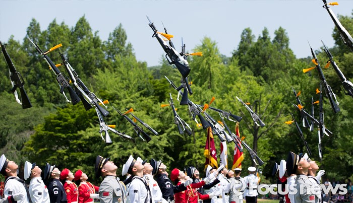 (서울=포커스뉴스) 26일 오후 서울 동작구 국립서울현충원 겨레얼마당에서 국방부 군악대와 의장대가 호국보훈의 달을 맞아 전통의장 및 퍼레이드 시범을 선보이고 있다.