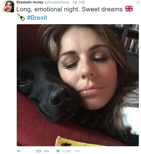 반면 브렉시트를 반기는 이들도 있다. 투표 전 세미누드 사진과 함께 브렉시트 찬성 의사를 밝히며 팬들을 독려한 영화배우 엘리자베스 헐리가 그렇다. 탈퇴파인 헐리는 개표 결과가 브렉시트 확정 쪽으로 기울자 "그리고 갑자기 새들이 지저귄다… 아직 TV에 붙어 있는 중이다"라고 트윗했다. 개표가 완료되자 "길고 감정적인 밤. 달콤한 꿈"이라고 영국 국기와 샴페인 이모티콘을 덧붙여 브렉시트를 환영했다.(런던/영국=게티/포커스뉴스) '해리포터' 작가 조앤 K 롤링이 지난 2012년 9월27일(현지시간) 영국 런던의 퀸엘리자베스홀에서 열린 행사에서 포토콜에 참여하고 있다. 2016.06.26 ⓒ게티이미지/이매진스 영국 배우 엘리자베스 헐리의 트위터. <사진출처=엘리자베스 헐리 트위터>
