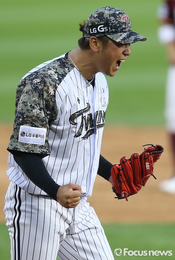 (서울=포커스뉴스) 26일 서울 잠실구장에서 열린 2016 프로야구 넥센-LG 경기 9회초 2사 만루에서 넥센 임병욱을 삼진 아웃시키며 승리를 지킨 LG 신승현이 주먹을 불끈 쥐며 환호하고 있다.