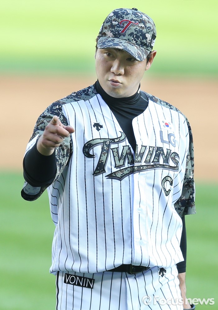 (서울=포커스뉴스) 26일 서울 잠실구장에서 열린 2016 프로야구 넥센-LG 경기에서 LG 투수 류제국이 7회 수비를 마치고 덕아웃으로 들어가며 포수 박재욱을 향해 격려의 사인를 보내고 있다.