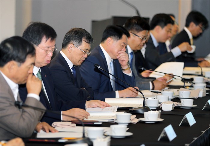 (서울=포커스뉴스) 27일 오전 서울 중구 소공동 플라자호텔 메이플홀에서 열린 신산업 민관협의회 제2차 회의에서 참석자들이 주형환 산업통상자원부 장관의 발언을 듣고 있다.