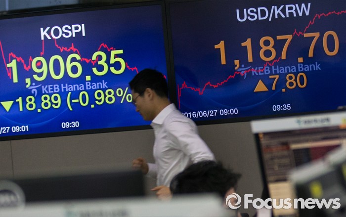(서울=포커스뉴스) 브렉시트(영국 EU 탈퇴) 충격이 지속되고 있는 27일 오전 서울 중구 명동 KEB 하나은행 딜링룸에서 딜러들이 업무를 보고 있다.코스피는 전 거래일보다 23.39(1.21%) 포인트 하락한 1901.85로, 코스닥은 전 거래일보다 17.95(2.77%) 포인트 하락한 629.21에 시작했다. 원달러 환율은 5.6원 내린 1,174.3원으로 개장했다.