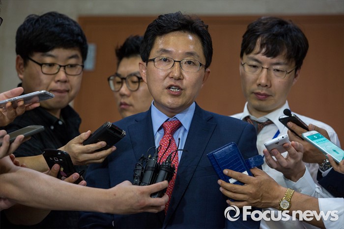 (서울=포커스뉴스) 김용태 새누리당 의원이 27일 오전 서울 여의도 국회에서 오는 8월 9일에 열리는 차기 전당대회 당 대표 경선 출마를 선언을 마친 뒤 취재진 질문에 답하고 있다.