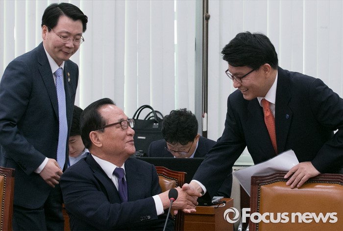 (서울=포커스뉴스) 27일 오전 서울 여의도 국회에서 열린 외교통일위원회 전체회의에 참석한 서청원(가운데), 윤상현(오른쪽) 새누리당 의원이 인사하고 있다. 왼쪽은 김형석 통일부 차관.
