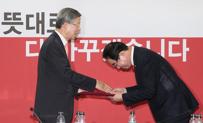 (서울=포커스뉴스) 김희옥(왼쪽) 새누리당 혁신비대위원장이 27일 오전 서울 여의도 당사에서 박명재 신임 사무총장에게 임명장을 수여하고 있다. <사진제공=새누리당>
