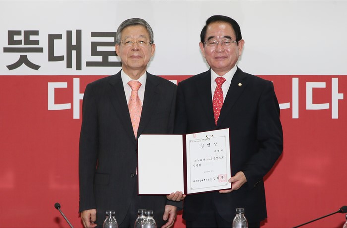 (서울=포커스뉴스) 김희옥(왼쪽) 새누리당 혁신비대위원장이 27일 오전 서울 여의도 당사에서 박명재 신임 사무총장에게 임명장을 수여한 뒤 기념촬영을 하고 있다. <사진제공=새누리당>