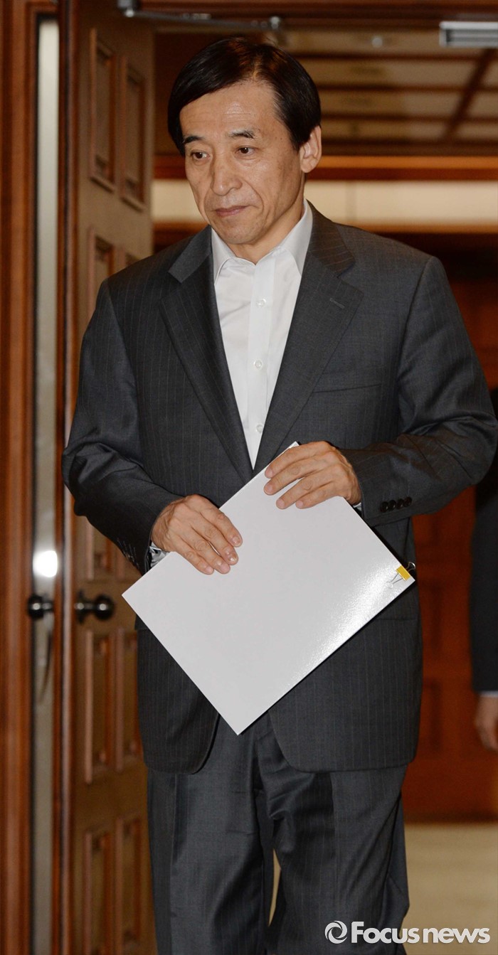(서울=포커스뉴스) 해외 순방에서 조기 귀국한 이주열 한국은행 총재가 27일 오후 서울 중구 한국은행에서 열린 긴급 간부회의에 참석해 모두발언 하고 있다. 이 총재는 이날 브렉시트(영국의 유럽연합 탈퇴)에 따른 국내외 금융시장 동향 점검 및 대응 방안 논의를 위해 회의를 주재했다.