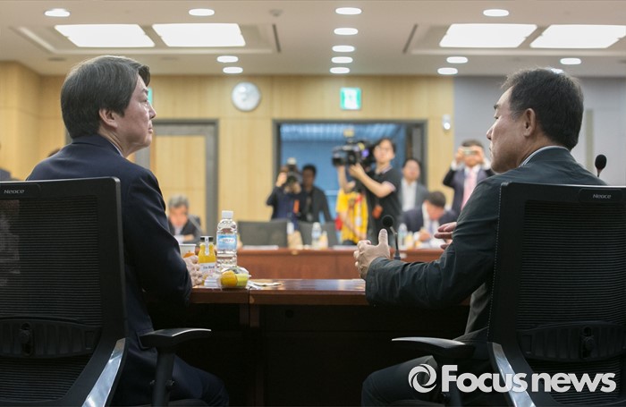 (서울=포커스뉴스) 28일 오전 서울 여의도 국회 의원회관에서 열린 국민의당 20차 정책역량강화 워크숍에 참석한 안철수(왼쪽) 상임공동대표가 강연자로 나선 변양호 보고펀드 대표와 대화하고 있다.