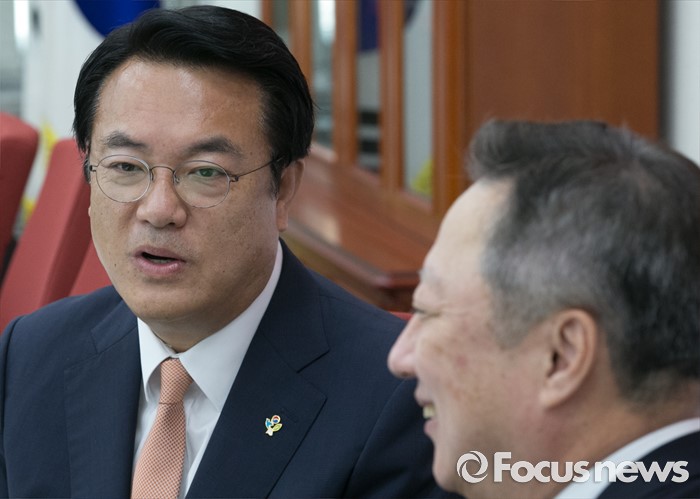 (서울=포커스뉴스) 정진석(왼쪽) 새누리당 원내대표가 28일 오전 서울 여의도 국회를 방문한 박용만 대한상공회의소 회장과 면담을 하고 있다.