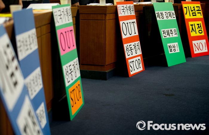 (서울=포커스뉴스) 28일 오전 서울 여의도 국회 헌정기념관에서 열린 '임을 위한 행진곡' 기념곡 지정저지 범국민대책본부 출범식 및 결의대회에 피켓들이 놓여 있다.