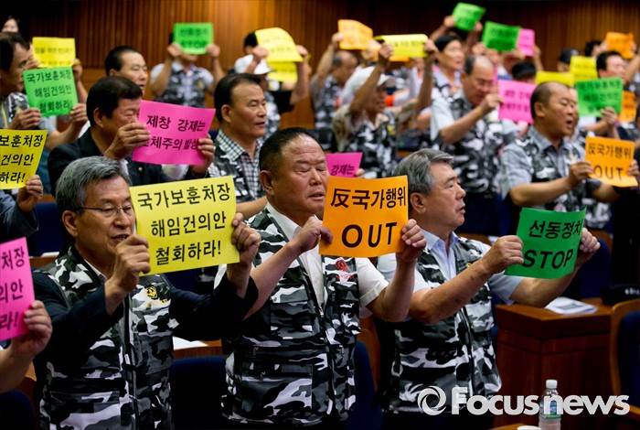 (서울=포커스뉴스) 28일 오전 서울 여의도 국회 헌정기념관에서 열린 '임을 위한 행진곡' 기념곡 지정저지 범국민대책본부 출범식 및 결의대회에 참석한 관련단체 회원 및 참석자들이 피켓을 들고 구호를 외치고 있다.