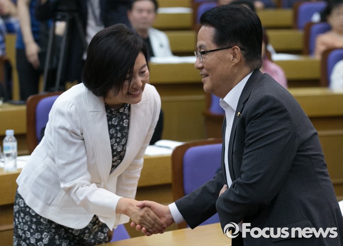 (서울=포커스뉴스) 28일 오전 서울 여의도 국회 의원회관에서 열린 '한국적 제3의 길' 창립 기념 초청 강연, '한국경제와 20대 국회가 가야할 길'에 참석한 박영선(왼쪽) 더불어민주당 의원과 박지원 국민의당 원내대표가 악수하고 있다.
