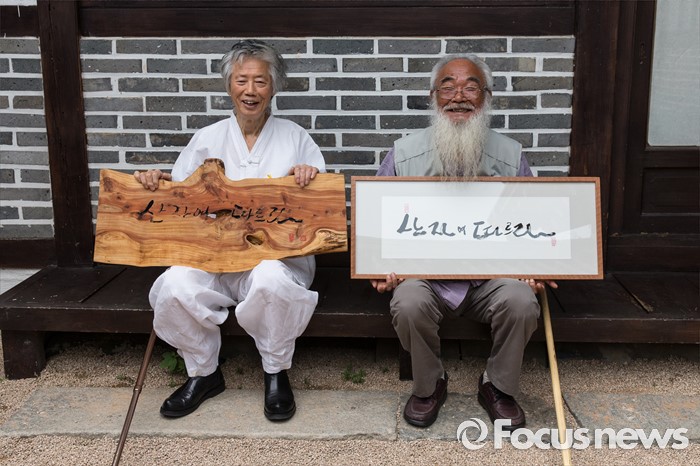 (서울=포커스뉴스) 28일 오전 서울 종로구 류가헌 갤러리에서 백기완(왼쪽) 통일문제연구소 소장과 문정현 신부가 '시대의 2인전 두 어른' 기자간담회가 끝나고 작품을 들고 기념촬영을 하고 있다.