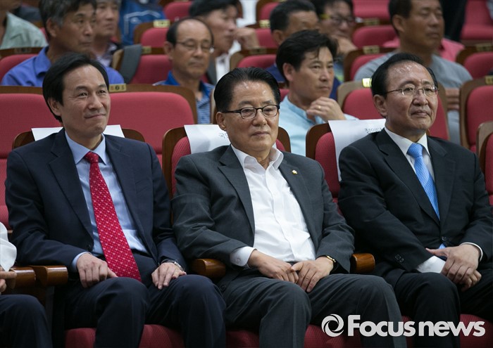 (서울=포커스뉴스) 28일 오후 서울 여의도 국회 의원회관에서 열린 20대 국회가 꼭 해야 할 농업개혁 과제 정책토론회에 참석한 우상호(왼쪽부터) 더불어민주당 원내대표, 박지원 국민의당 원내대표, 노회찬 정의당 원내대표가 자리하고 있다.