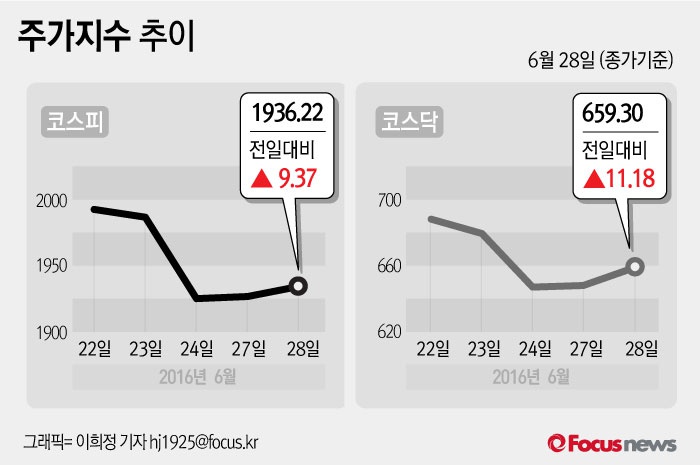 (서울=포커스뉴스) 28일 코스피지수는 전날보다 0.49%(9.37포인트) 오른 1936.22에 장을 마쳤다. 코스닥지수는 전일 대비 1.72%(11.18포인트) 오른 659.30에 마감했다.