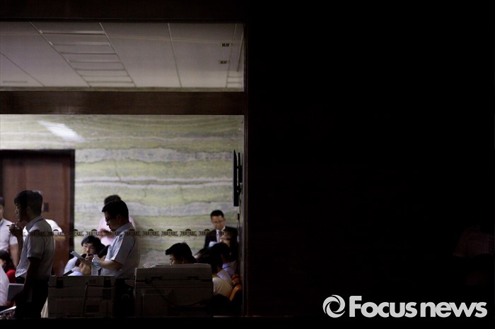 (서울=포커스뉴스) 28일 오후 서울 여의도 국회에서 상임위원회에 업무 지원을 나선 관계기관 공무원들이 전체회의가 열리는 회의실 밖을 지키며 업무를 보고 있다.