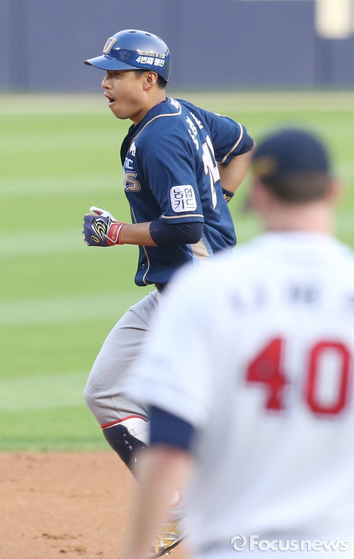 (서울=포커스뉴스) 28일 서울 잠실구장에서 열린 2016 프로야구 NC-두산 경기 2회초 NC 선두타자 조영훈이 두산 투수 니퍼트의 초구를 떄려 우월 솔로 홈런을 치고 베이스를 돌고 있다.