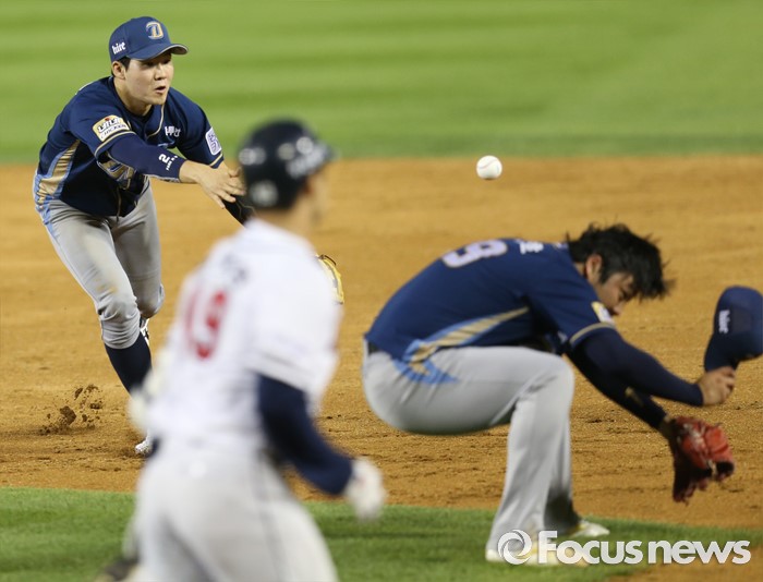 (서울=포커스뉴스) 28일 서울 잠실구장에서 열린 2016 프로야구 NC-두산 경기 5회말 무사 1,3루에서 NC 2루수 박민우가 두산 민병헌의 땅볼 타구를 잡아 1루로 토스하고 있다. 1루로 백업 들어가던 투수 이민호가 납작 엎드리고 있다.