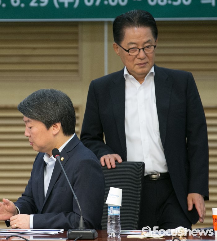 (서울=포커스뉴스) 29일 오전 서울 여의도 국회 의원회관에서 열린 국민의당 정책역량강화 워크숍에 참석한 안철수(왼쪽) 상임공동대표와 박지원 원내대표가 참석하고 있다.