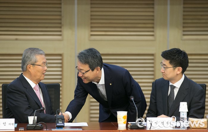 (서울=포커스뉴스) 29일 오전 서울 여의도 국회 의원회관에서 열린 아젠다 2050 창립총회에 참석한 김종인(왼쪽) 더불어민주당 비대위 대표와 김성식(가운데) 국민의당 정책위의장이 인사하고 있다. 오른쪽은 김세연 새누리당 의원.