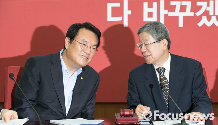 (서울=포커스뉴스) 김희옥(오른쪽) 새누리당 혁신비대위원장과 정진석 원내대표가 29일 오전 서울 여의도 당사에서 열린 혁신비대위원회의에 참석해 대화하고 있다.