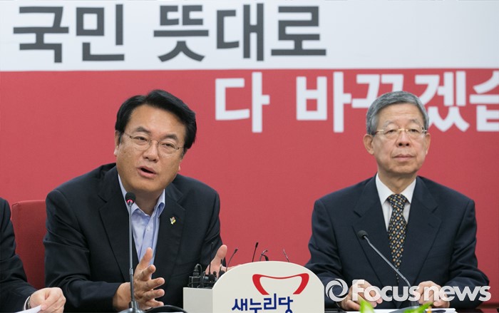(서울=포커스뉴스) 정진석 새누리당 원내대표가 29일 오전 서울 여의도 당사에서 열린 혁신비대위원회의에 참석해 모두발언을 하고 있다. 오른쪽은 김희옥 혁신비대위원장.
