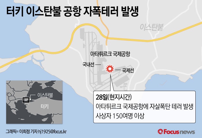 앞서 28일(현지시간) 터키 이스탄불 아타튀르크 국제공항에서 자살 폭탄테러로 150여명이 넘는 사상자가 발생했다.
